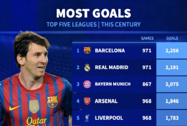 BongDa.com.vnTheo thống kê của Transfermarkt, những câu lạc bộ hàng đầu tại 5 giải đấu châu Âu ghi nhiều bàn thắng nhất kể từ năm 2000, có Barcelona dẫn đầu với 2256 bàn và Real Madrid theo sau với 2191 bàn.