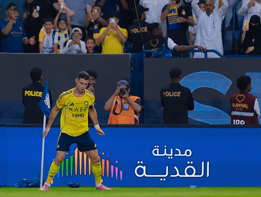 Ronaldo lập cú đúp bàn thắng, cán mốc 945 bàn thắng. Ảnh: Al Nassr
