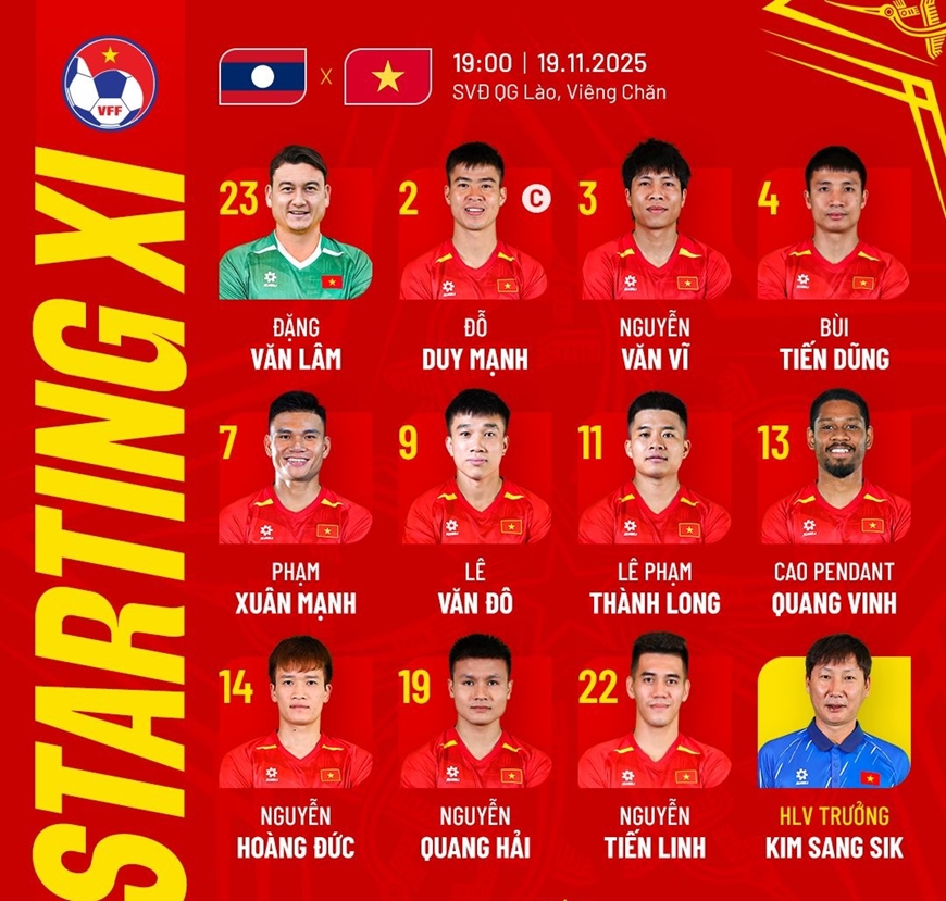Tối 19-11, đội tuyển Việt Nam làm khách trên sân của đội tuyển Lào thuộc lượt trận thứ 5 bảng F vòng loại thứ 3 Asian Cup 2027. Đúng như dự đoán, huấn luyện viên Kim Sang-sik không mạo hiểm dùng tiền đạo Xuân Son ngay từ đầu mà sử dụng hàng công với Tiến Linh, Quang Hải.