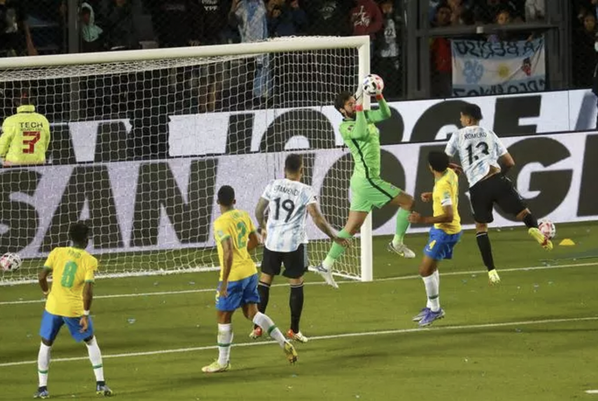 Tình huống cứu thua của thủ thành Alisson Becker bên phía Brazil trong trận đấu với Argentina v. Ảnh: Twitter