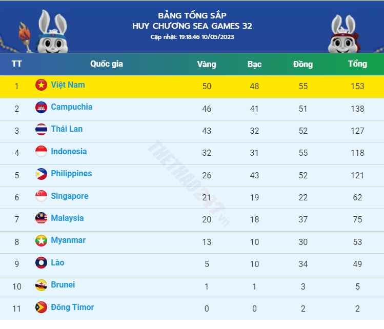 Bảng tổng sắp huy chương SEA Games 32 tính đến 19 giờ 30 phút tối 10-5, Đoàn Thể thao Việt Nam vươn lên dẫn đầu với 50 Huy chương Vàng, 48 Huy chương Bạc và 55 Huy chương Đồng.