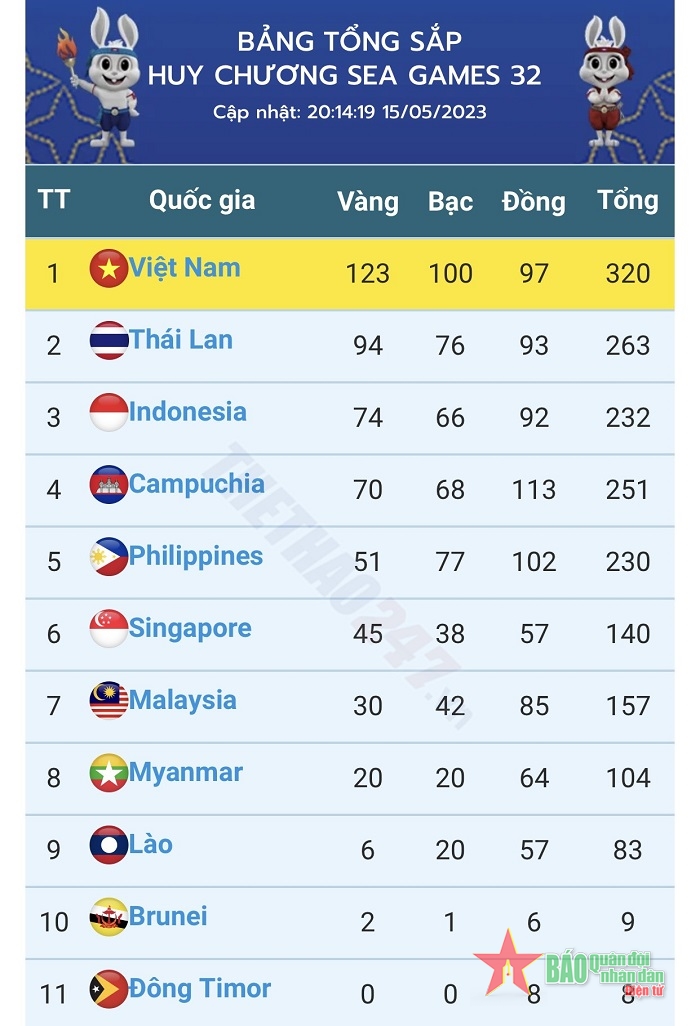 Bảng tổng sắp huy chương SEA Games 32 ngày 15-5 tính đến 20 giờ 30, đoàn thể thao Việt Nam vượt mục tiêu với 123 HCV, đồng thời giữ vững vị trí số 1 trên bảng tổng sắp huy chương.