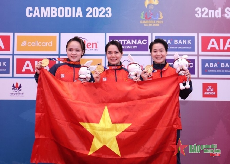 Niềm vui của Nguyễn Thị Phương, Lưu Thị Thu Uyên và Nguyễn Ngọc Trâm giành HCV : Ảnh: VIỆT AN