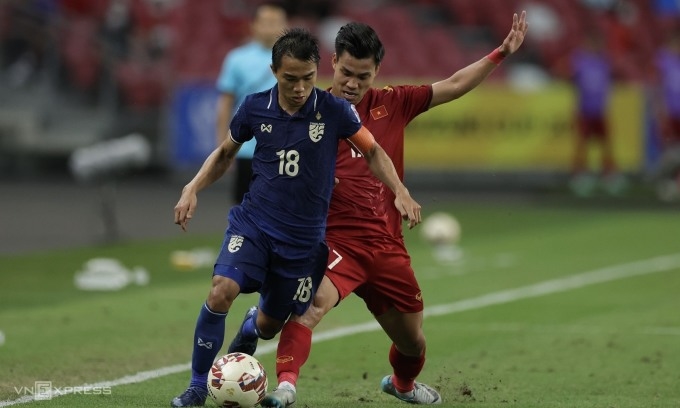 Văn Thanh tranh chấp với Chanathip Songkrasin trong trận lượt đi bán kết AFF Cup 2020 trên SVĐ Quốc gia Singapore hôm 23-12. Ảnh: Leo Shang-wei