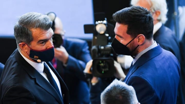 L.Messi và chủ tịch Joan Laporta trong cuộc gặp gần đây. Ảnh: 90min