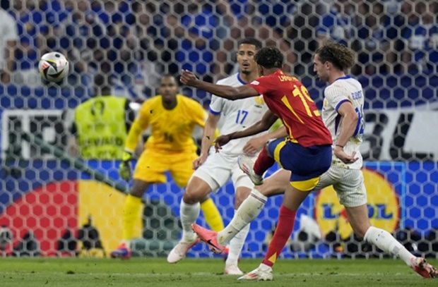 Bàn thắng đầu tiên tại EURO ở tuồi 16 của Lamine Yamal là một tuyệt phẩm.Khi đội nhà đang bị lấn lướt về mặt thế trận, một ngôi sao của tuyển Tây Ban Nha đã biết lên tiếng rất đúng lúc. Thoạt nhìn tình huống trông không quá nguy hiểm bởi có tới 4 chiếc bóng áo trắng án ngữ ngay phía trước Lamine Yamal, thế nhưng thần đồng 16 tuổi vẫn tìm cách lách qua được Adrien Rabiot và vẽ nên 1 đường cong tuyệt mỹ chạm cột dọc xa vào lưới. Thủ thành Mike Maignan dù bay người hết cỡ vẫn không thể chạm tay vào bóng.”Cậu ấy là một siêu sao!Yamal trở thành cầu thủ trẻ nhất ghi bàn tại EURO theo cách thật quá tuyệt vời!Cầu thủ 16 tuổi này đưa bóng sang chân trái và khi còn cách khung thành khoảng 25 thước, cậu ấy đã có một cú sút tuyệt diệu đưa bóng chạm mép trong cột dọc bên trái.Wow! Bàn thắng đến hoàn toàn tự nhiên”. Nhà đài Sky Sports không tiếc lời khen ngợi siêu phẩm của Lamine Yamal.