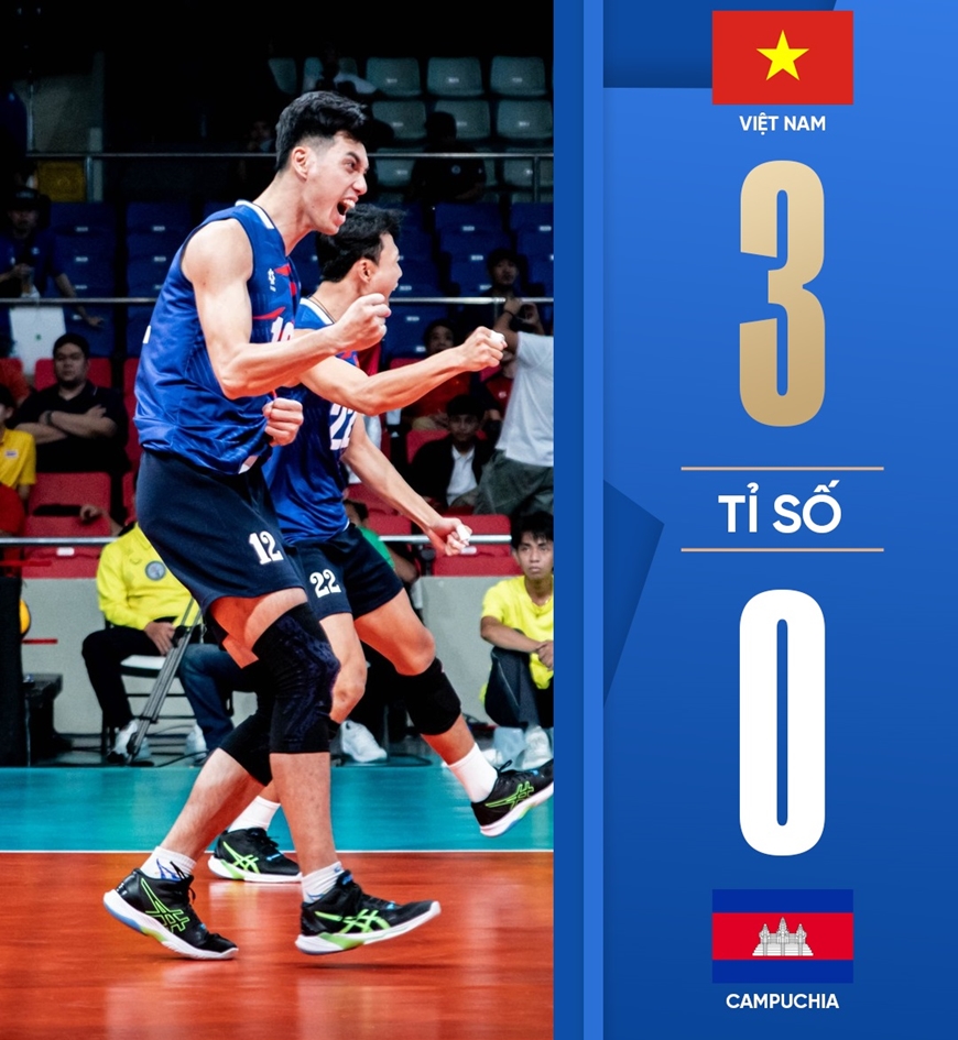 Đội tuyển bóng chuyền nam Việt Nam có thắng lợi 3-0 trước Campuchia ở trận mở màn chặng 2 Giải bóng chuyền vô địch Đông Nam Á SEA V-League 2025.