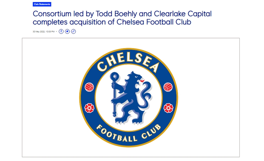 Trang chủ của Chelsea thông báo về việc liên minh Todd Boehly/Clearlake Capital hoàn tất thủ tục mua đội bóng. Ảnh chụp màn hình