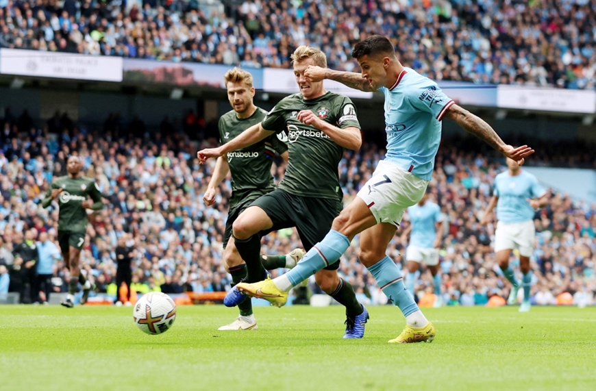Theo đó, phút 20, Cancelo có pha độc diễn ở hành lang trái. Chân sút người Bồ Đào Nha đi bóng qua 3 cầu thủ Southampton trước khi thoải mái tung cú sút hạ gục thủ thành Bazunu để mở tỷ số cho Man City.