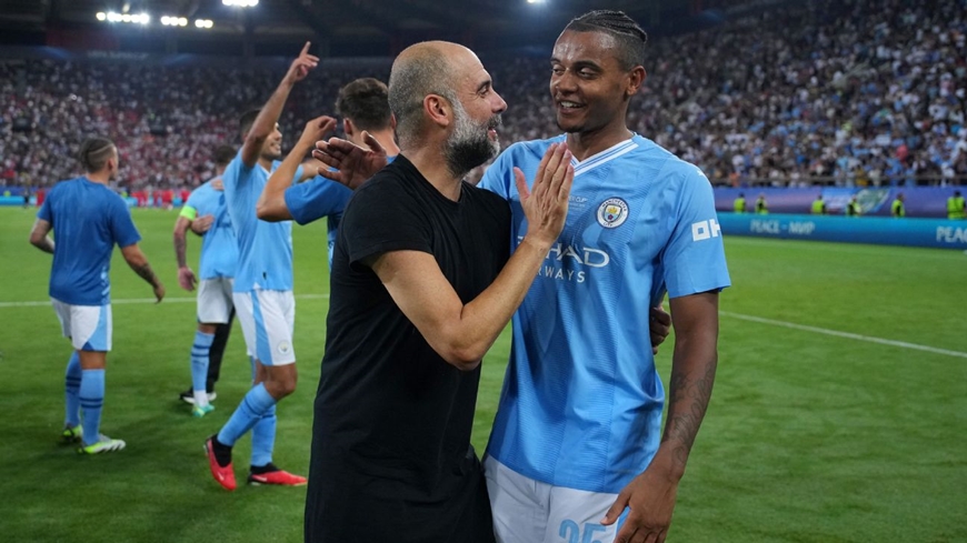 Pep chia vui với Akanji sau chiến thắng của Manchester City. Ảnh: ESPN