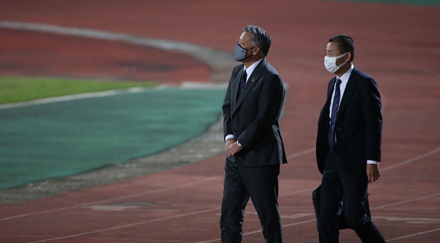 Chủ tịch JFA Kozo Takashima (bên trái) theo dõi đội tuyển Nhật Bản tập luyện từ xa trên sân Mỹ Đình-Hà Nội.Ảnh: LÂM THỎA