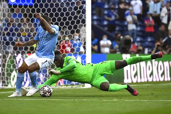 Tình huống đi bóng nguy hiểm của Sterling ở phút thứ 8 bị thủ thành Mendy chặn đứng. Ảnh: The Guardian