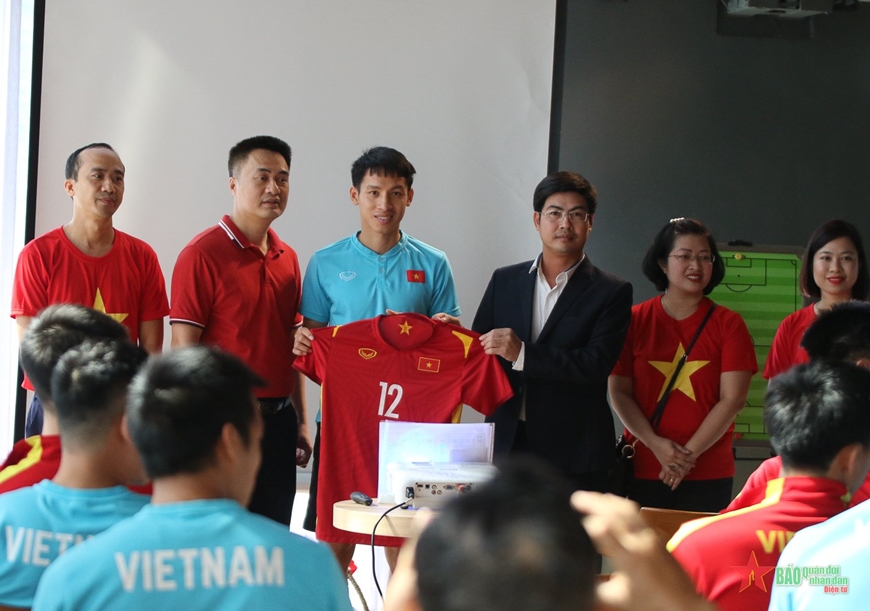 Đội trưởng Đỗ Hùng Dũng thay mặt toàn đội trao áo đấu tặng đại diện Đại sứ quán Việt Nam tại Thái Lan.