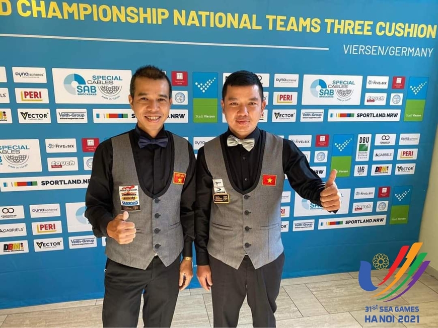 Cơ thủ Trần Quyết Chiến và Nguyễn Đức Anh Chiến thi đấu xuất sắc tại Giải Billiards Carom 3 băng đồng đội thế giới 2022. Ảnh: TTVN.