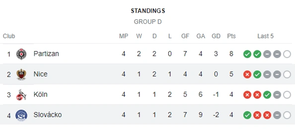 Phải chờ đến loạt trận thứ 4 bảng D vào rạng sáng 14/10, Slovacko mới tìm được 3 điểm đầu tiên ở Conference League mùa này. Họ đã có 4 điểm, bằng Koln nhưng vẫn đứng chót bảng. Nice có 5 điểm còn Partizan đứng đầu với 8 điểm. Đại diện từ Serbia gần như chắc chắn sẽ đứng đầu bảng. Cuộc cạnh tranh thực tế chỉ nhằm hướng tới vị trí nhì bảng, nơi cả Nice, Koln và Slovacko đều còn cơ hội.