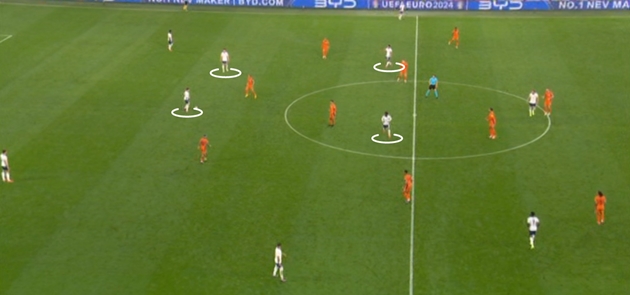 Số đông nhân sự ở hàng tiền vệ giúp tuyển Anh kiểm soát thế trận.Đó cũng là 45 phút cực kỳ ấn tượng của Kobbie Mainoo, người thực hiện hầu hết các pha chạm bóng ở 1/3 phần sân đối phương. Mặc dù trên danh nghĩa, anh bắt đầu trận đấu với tư cách là một tiền vệ lùi sâu. Cầu thủ mang áo số 26 thường cố gắng hướng bóng đến vị trí của Bukayo Saka bên cánh trái.2. Điểm yếu và điểm mạnh của việc mất cân bằng bên cánh trái Sự mất cân bằng bên cánh trái là vấn đề của tuyển Anh kể từ đầu giải, khi Kieran Trippier buộc phải chơi trái sở trường trong bối cảnh Luke Shaw chưa hoàn toàn bình phục chấn thương. Dẫu sao, hậu vệ thuộc biên chế Newcastle United đã có một hiệp đấu phòng ngự tốt trước Hà Lan, dù ở khía cạnh tấn công, cầu thủ này còn nhiều hạn chế.