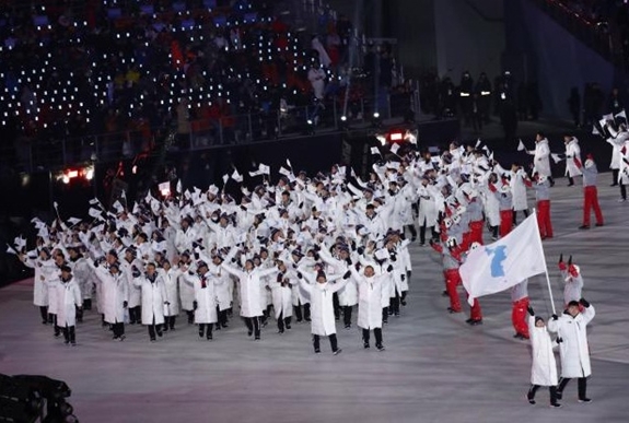 Đoàn đại biểu hai miền Triều Tiên diễu hành dưới một lá cờ thống nhất tại Thế vận hội mùa Đông năm 2018. Ảnh: lequipe.fr.