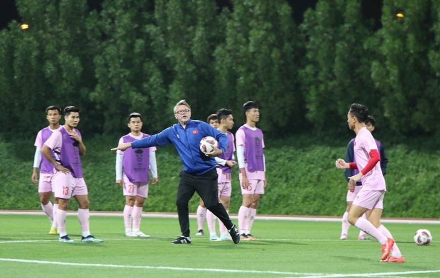 HLV Troussier chỉ đạo sát sao các học trò trong buổi tập. Ảnh: qdnd.vn