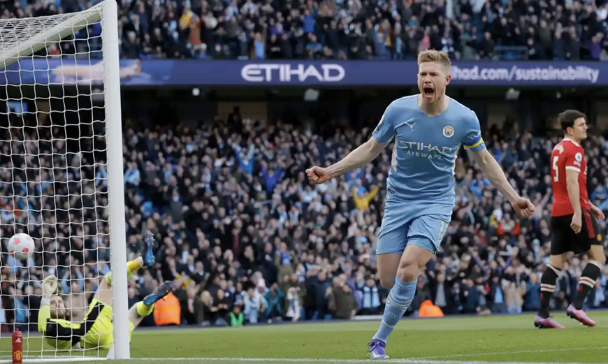 Kevin De Bruyne tỏa sáng với 1 cú đúp góp công, giúp Man City đánh bại MU 4-1 ở trận derby thành Manchester. Ảnh: The Guardian