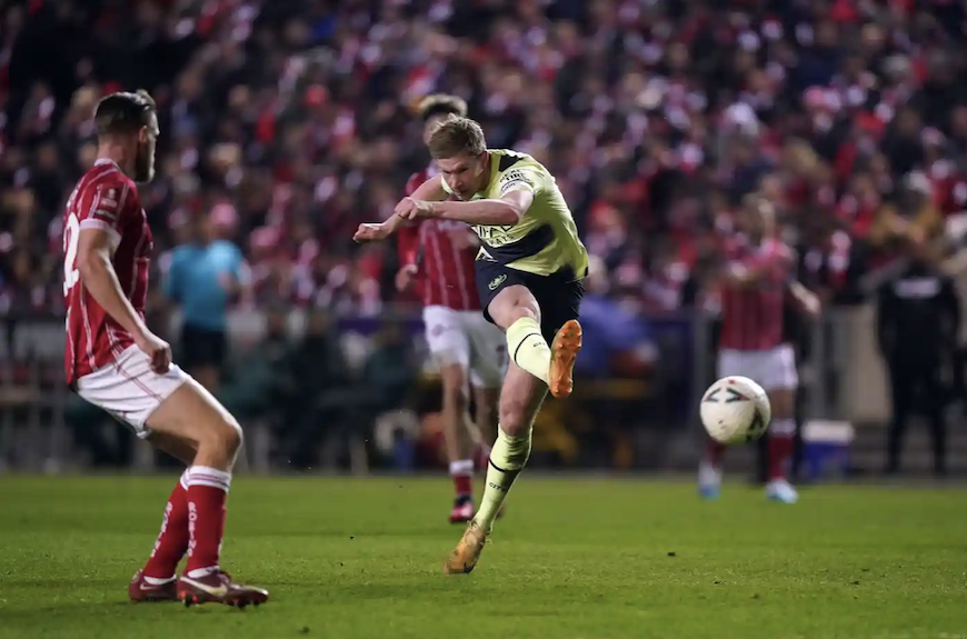 Kevin De Bruyne ghi bàn ấn định chiến thắng 3-0 cho Man City trước Bristol City. Ảnh: The Guardian