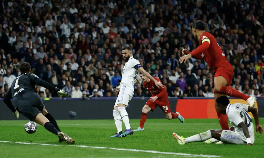 Benzema ghi bàn thắng duy nhất ở trận lượt về vòng 1/8, giúp Real Madrid đánh bại Liverpool 6-2 sau hai lượt trận để đi tiếp vào tứ kết Champions League. Ảnh: The Guardian