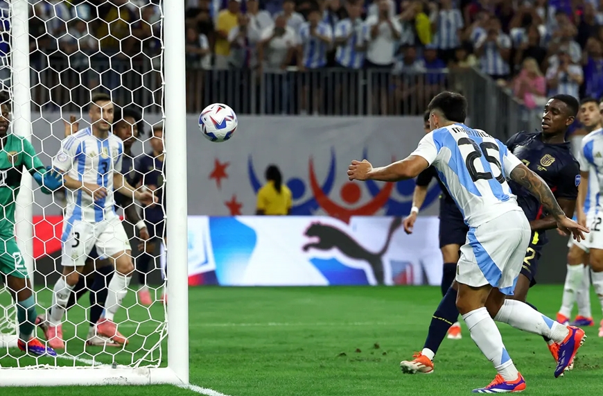 Phải tới phút 35, Argentina mới tìm được bàn thắng phá vỡ thế quân bình. Theo đó, từ quả đá phạt góc bên cánh phải, Mac Allister đánh đầu ngược, mở ra cơ hội để Lisandro Martínez dứt điểm bồi đưa bóng vượt qua vạch vôi khung thành Ecuador.