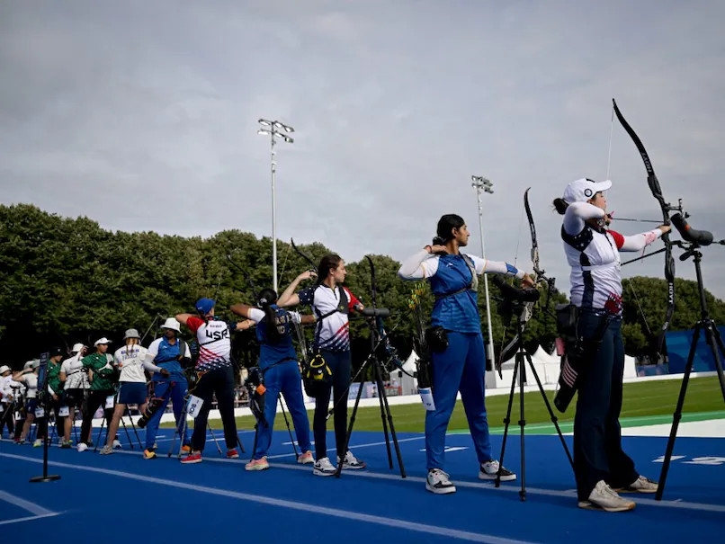Các vận động viên tranh tài vòng phân hạng nội dung cung 1 dây cá nhân nữ tại Olympic Paris 2024. Ảnh: AFP
