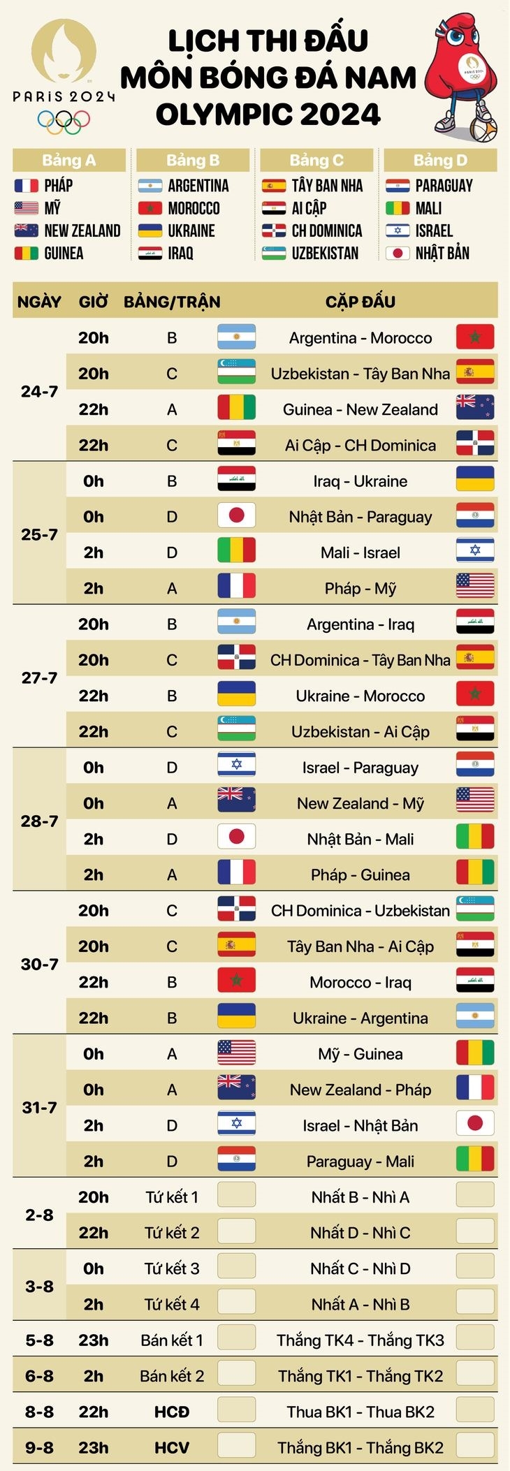 Môn bóng đá nam Olympic Paris 2024 diễn ra từ ngày 24-7 đến 9-8, quy tụ 16 đội tuyển xuất sắc nhất thế giới. Các đội chia thành 4 bảng, gồm: Bảng A-Pháp, Mỹ, Guinea, New Zealand; bảng B-Argentina, Morocco, Iraq, Ukraine; bảng C-Uzbekistan, Tây Ban Nha, Ai Cập, Cộng hòa Dominica; bảng D-Nhật Bản, Paraguay, Mali và Israel.