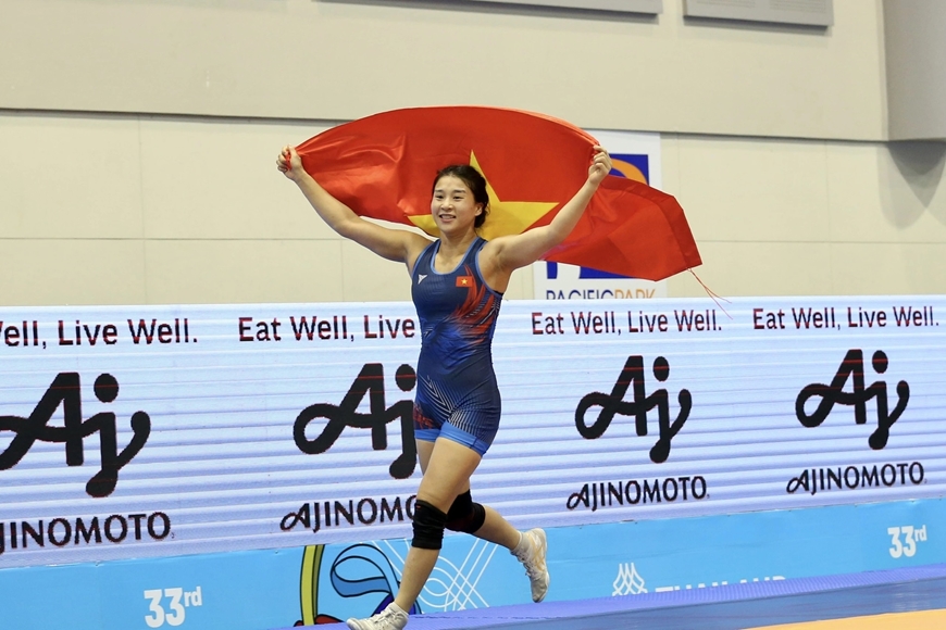 Đô vật Mỹ Trang mừng tấm huy chương vàng SEA Games 33. Ảnh: TNO