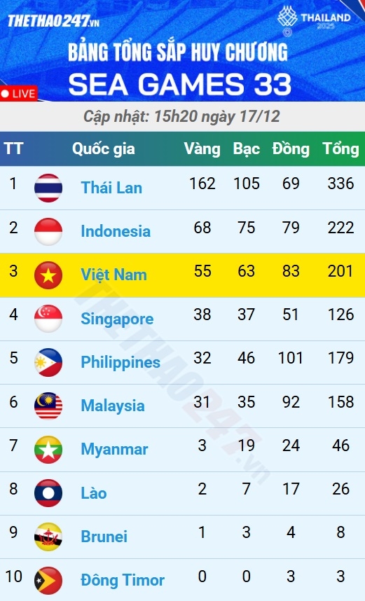 Bảng tổng sắp huy chương SEA Games 33 tính đến 15 giờ 20 phút ngày 17-12. Ảnh: Thethao247