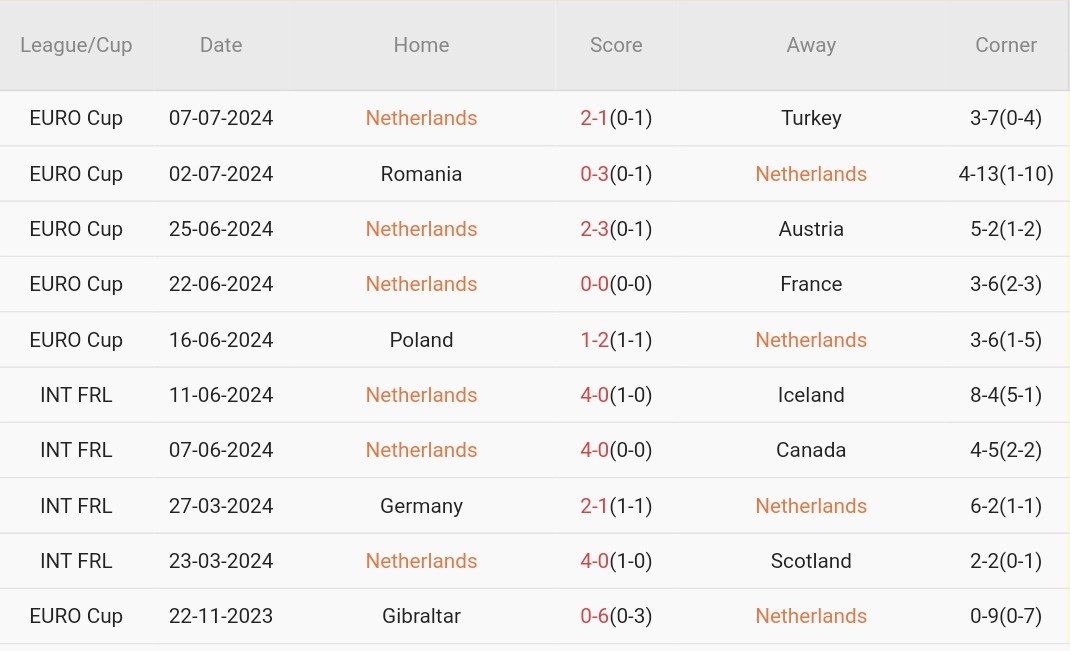 Sân vận động Signal Iduna Park, MunichPhong độ10 trận gần nhất, Hà Lan thắng 7, hòa 1, thua 2. Tỷ lệ thắng đạt 70%, tỷ lệ thắng kèo châu Á đạt 80%. Tỷ lệ tài 90%.10 trận gần nhất, Anh thắng 2, hòa 6, thua 2. Tỷ lệ thắng đạt 20%, tỷ lệ thắng kèo châu Á đạt 20%. Tỷ lệ tài đạt 10%.Cầu thủ đáng xemCody Gakpo (Hà Lan)Bỏ qua chuỗi phong độ không mấy ấn tượng dưới màu áo Liverpool, Gakpo đã và đang bùng nổ mạnh mẽ tại giải đấu lần này, góp công lớn giúp Hà Lan tiến vào bán kết với 3 bàn thắng cùng 1 pha kiến tạo. Với việc Tam Sư đã để thủng lưới trong hai trận liên tiếp, chắc chắn Gakpo sẽ mang đến rất nhiều sóng gió cho khung thành của Jordan Pickford ở trận đấu sắp tới.Bukayo Saka (Anh)Bàn thắng của “báu vật” Arsenal ở phút 80 đã cứu rỗi Anh trước Thụy Sĩ cách đây vài ngày, và anh cũng thực hiện thành công quả penalty của mình trong loạt sút luân lưu để giúp Tam Sư bước vào bán kết. Kể từ đầu năm 2024, Saka đang có được phong độ cao cho cả Arsenal lẫn Anh, và với việc đã nhiều lần thể hiện bản lĩnh của mình trong những thời khắc quan trọng ở các trận đấu lớn, chân sút 22 tuổi chắc chắn là một cái tên mà Hà Lan phải đề phòng.Thống kê thú vịTuyển Anh vẫn đang bất bại ở EURO 2024, tính đến thời điểm hiện tại.Anh chỉ giành được duy nhất một chiến thắng trước Hà Lan trong 9 lần chạm trán gần nhất.Hà Lan là đội sở hữu thành tích ghi bàn ấn tượng nhất tại giải đấu năm nay, với 9 bàn sau 5 trận.Hà Lan vs Anh: Soi kèo- Hà Lan ghi được nhiều bàn thắng nhất từ phút 76-90 (30 trận gần nhất), từ phút 76-90 (50 trận gần nhất).- Anh ghi được nhiều bàn thắng nhất từ phút 31-45 (30 trận gần nhất), từ phút 31-45 (50 trận gần nhất).- Hà Lan thủng lưới nhiều nhất từ phút 1-15 và 76-90 (30 trận gần nhất), từ phút 76-90 (50 trận gần nhất).- Anh thủng lưới nhiều nhất từ phút 61-75 (30 trận gần nhất), từ phút 61-75 (50 trận gần nhất).7 trận gần nhất giữa hai đội, Hà Lan thắng 2, hòa 4, thua 1. Tỷ lệ thắng đạt 28.6%, tỷ lệ thắng kèo châu Á đạt 57.1%. Tỷ lệ tài đạt 60%.Lực lượngSouthgate sẽ có được sự phục vụ của Marc Guehi, người trở lại sau án treo giò một trận, và dự kiến Luke Shaw cũng đủ khả năng đá chính. Bên kia chiến tuyến, ngoài sự vắng mặt của Ian Maatsen, Koeman không đối mặt với bất kỳ chấn thương hay án treo giò nào.Đối đầuTổng số trận đấu – 22Hà Lan thắng – 7Anh thắng – 6Hòa: 9Đội hình dự kiếnHà Lan (4-2-3-1)Verbruggen (Thủ môn); Dumfries, De Vrij, Van Dijk, Ake; Schouten, Reijnders; Bergwijn, Simmons, Gakpo; DepayAnh (3-4-2-1)Pickford (Thủ môn); Walker, Stones, Guehi; Saka, Mainoo, Rice, Shaw; Foden, Bellingham; KaneDự đoán Hà Lan vs AnhKỳ vọng trận đấu này sẽ là một màn tranh tài thực sự cân sức giữa hai đội, mặc dù Anh có thể chiếm đôi chút thế thượng phong trong một số khoảnh khắc quan trọng nhờ chất lượng đội hình và sự hiện diện của những cầu thủ lớn.Dự đoán tỷ số từ Whoscored: Hà Lan 1-1 AnhDự đoán tỷ số từ chuyên gia (Steen Kirby): Hà Lan 1-1 Anh (Anh thắng trong loạt sút luân lưu)Dự đoán tỷ số từ Bongda.com.vn: Hà Lan 2-2 Anh (Anh thắng trong loạt sút luân lưu)