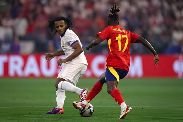Trong trận đấu giữa Tây Ban Nha và Pháp, với việc được huấn luyện viên Luis de la Fuente xếp chơi bên cánh trái, Nico Williams thường xuyên có những tình huống một đấu một với Jules Kounde.Trước sự truy cản quyết liệt đến từ hậu vệ thuộc biên chế Barcelona, Nico Williams phần nào đã bị hạn chế khả năng tấn công.Jules Kounde sẵn sàng đua tốc độ với Nico Williams khi cần thiết.Không những thế, Nico Williams còn vấp phải sự thách thức đến từ thủ thành Mike Maignan.Ngay đầu hiệp hai, đón đường chọc khe của đồng đội, những tưởng Nico Williams sẽ có cơ hội thoát xuống bên hành lang cánh trái.Tuy nhiên, thủ thành Mike Maignan đã đọc tình huống tốt và lao ra xoạc bóng thành công.Pha xoạc bóng mẫu mực của thủ thành thuộc biên chế AC Milan khiến Tây Ban Nha mất đi một tình huống tấn công nguy hiểm.Ít phút sau, với hàng loạt tình huống xử lý bóng kỹ thuật, Nico Williams đã xỏ háng thành công Jules Kounde.Tuy nhiên, hậu vệ mang áo số 5 của tuyển Pháp cũng đọc tình huống rất nhanh để hóa giải pha qua người của Nico WIlliams. Dù bị xỏ háng nhưng anh vẫn lấy được bóng để chuyền về cho Mike Maignan.Dù tuyển Pháp thất bại nhưng Jules Kounde cũng phần nào đó thành công trong việc phong tỏa Nico Williams. Anh được Whoscored chấm 7,1 điểm, cao nhất bên phía “Les Bleus”.