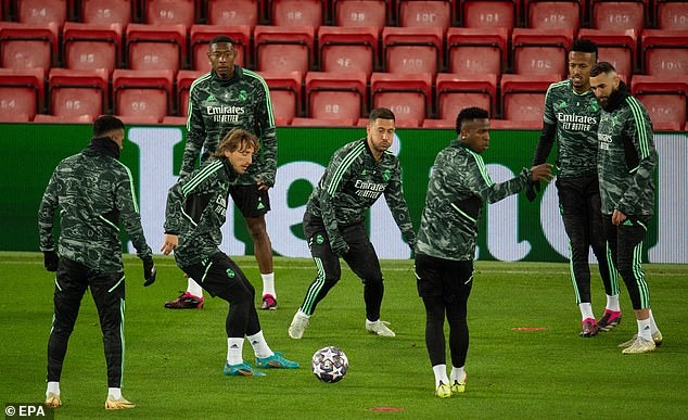 Các cầu thủ Real Madrid tập luyện trên sân Anfield để chuẩn bị cho cuộc đối đầu với Liverpool ở vòng 1/8 Champions League. Ảnh: EPA