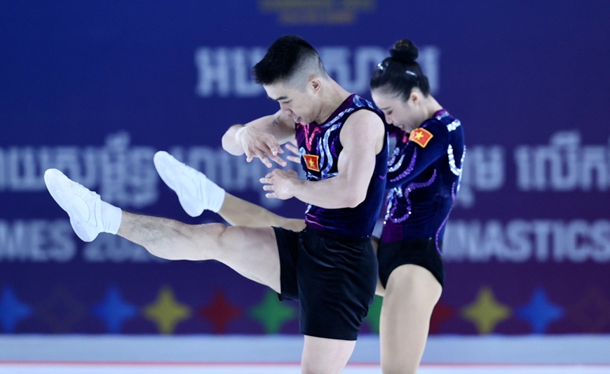 Sáng 14-5, tại Campuchia, đội tuyển thể dục aerobic Việt Nam liên tiếp mang về 2 tấm huy chương vàng nội dung đôi nam nữ và đồng đội 5 người cho đoàn thể thao Việt Nam.