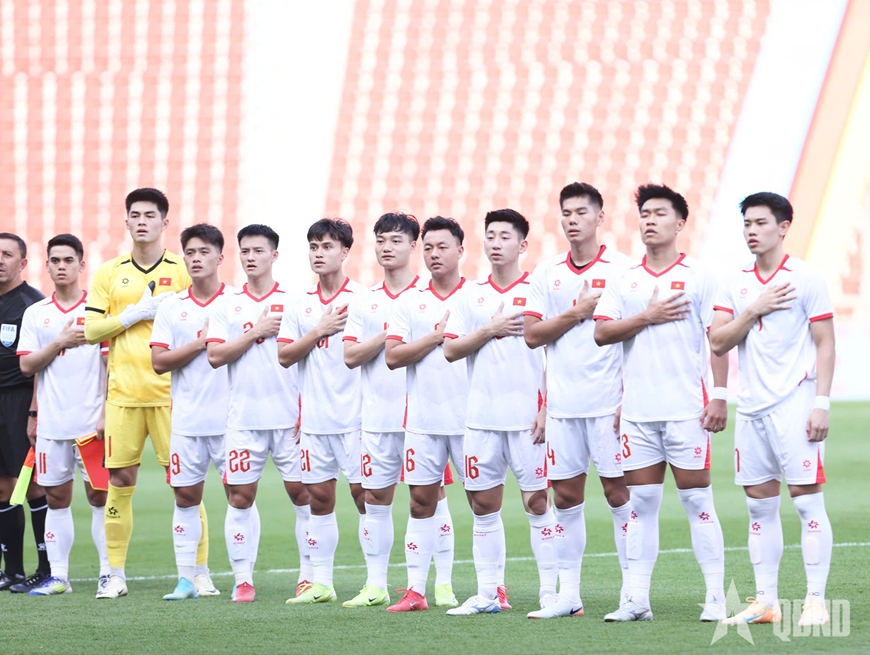 Các tuyển thủ U22 Việt Nam thực hiện nghi thức chào cờ. Ảnh: VIỆT AN
