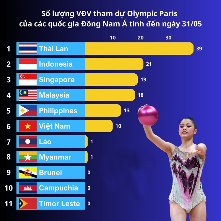 Tính đến ngày 31-5, thể thao Thái Lan đã sở hữu 39 suất dự Olympic Paris 2024, dẫn đầu khu vực Đông Nam Á. Xếp ở các vị trí tiếp theo lần lượt là: Indonesia (21 suất), Singapore (19 suất), Malaysia (18 suất), Philippines (13 suất), Việt Nam (10 suất)… Cụ thể, 10 suất chính thức tham dự Thế vận hội của thể thao Việt Nam đến từ: Nguyễn Thùy Linh, Lê Đức Phát (cầu lông); Trịnh Thu Vinh, Lê Thị Mộng Tuyền (bắn súng); Nguyễn Huy Hoàng (bơi); Nguyễn Thị Thật (xe đạp); Trịnh Văn Vinh (cử tạ); Võ Thị Kim Ánh (boxing); Nguyễn Thị Hương (canoeing) và Phạm Thị Huệ (rowing).