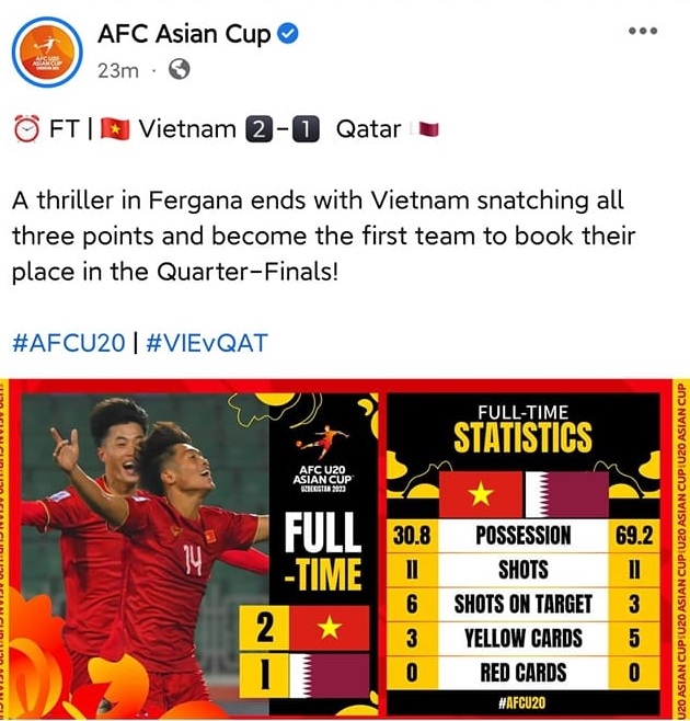 Liên đoàn Bóng đá châu Á (AFC) cũng nhầm lẫn với bài đăng trên mạng xã hội khi tuyên bố: “U20 Việt Nam trở thành đội bóng đầu tiên góp mặt ở tứ kết”. Trong bài tường thuật, AFC bình: “Bằng thế trận kiên trì, nhẫn nại đợi thời cơ, chiến thuật của Việt Nam đã đơm hoa kết trái bằng các bàn thắng muộn ở mỗi hiệp. Với hai thắng lợi trước Australia và Qatar, đội bóng Đông Nam Á đang tạo ấn tượng mạnh mẽ ở giải đấu năm nay”.
