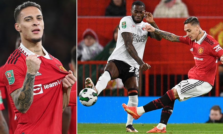 Phút 21, từ pha phối hợp giữa Garnacho và Fred, Antony nhận được bóng rồi thực hiện cú cứa lòng chân trái hạ gục thủ thành Maynard-Brewer, qua đó mở tý số trận đấu.