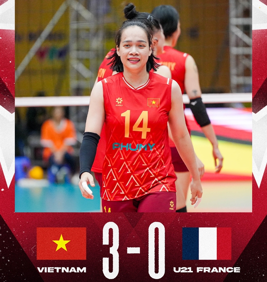 Trong ngày ra quân giải đấu gặp U21 Pháp diễn ra sáng 13-7, đội tuyển bóng chuyền nữ Việt Nam đã giành chiến thắng dễ dàng với tỷ số 3-0 (25-22, 25-15, 25-11).