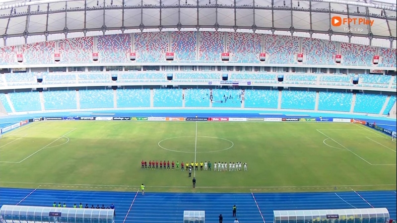 U23 Lào và U23 Thái Lan làm thủ tục trước trận đấu. Ảnh chụp màn hình.