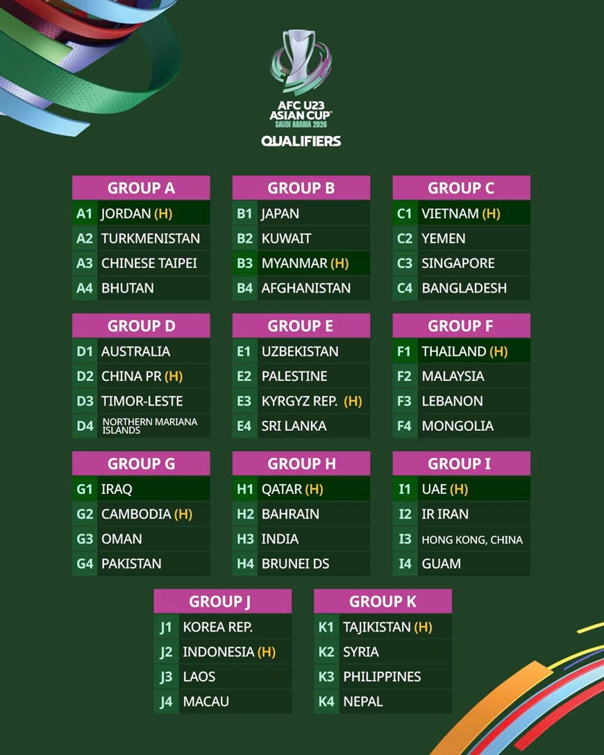 Kết quả bốc thăm chia bảng vòng loại Giải bóng đá U23 châu Á 2026. Ảnh: AFC