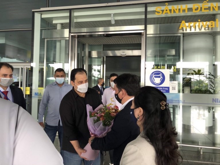 Ông Yasser Al-Mishal, Chủ tịch SAFF (bên trái) được ông Lê Hoài Anh, Tổng thư ký VFF chào đón tại Sân bay quốc tế Nội Bài ngày 15-11. Ảnh: VFF