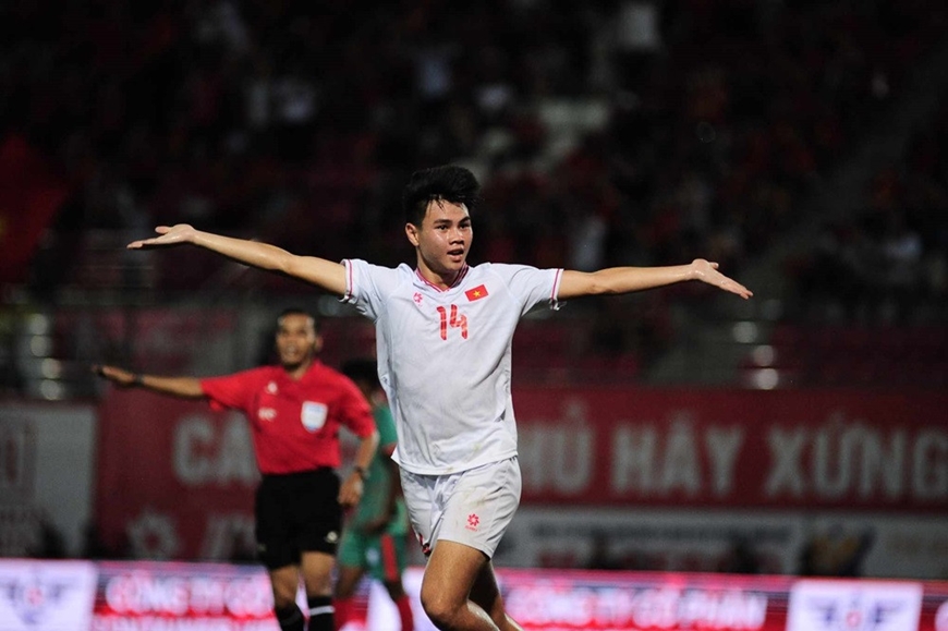 Minh Tiến mừng bàn thắng vào lưới U20 Bangladesh. Ảnh: Vietnamnet