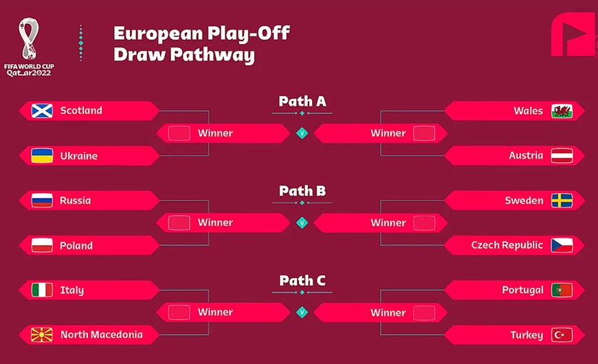Theo đó, nhóm A là hai cặp đấu Scotland – Ukraine và xứ Wales – Áo. Nhóm B là Nga – Ba Lan và Thụy Điển – Cộng hòa Séc. Cuối cùng là nhóm C với Italia – Bắc Macedonia và Bồ Đào Nha – Thổ Nhĩ Kỳ.