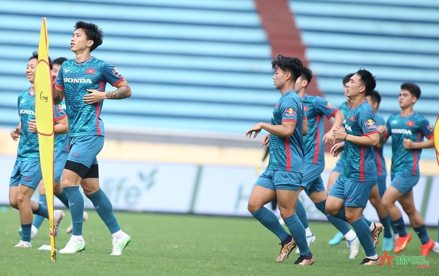 Các cầu thủ đội tuyển Việt Nam tập luyện trước trận gặp Syria. Ảnh: VIỆT AN