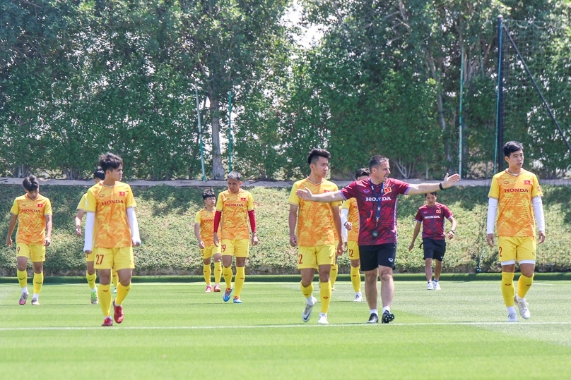 Buổi tập của thầy trò huấn luyện viên Troussier trước trận U23 Việt Nam và U23 UAE. Ảnh: VFF