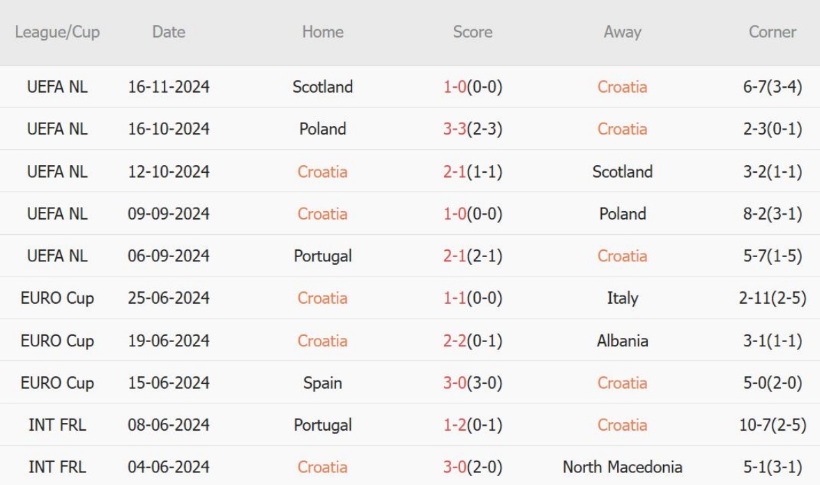 10 trận gần nhất, Croatia thắng 4, hòa 3, thua 3. Tỷ lệ thắng 40%. Tỷ lệ thắng kèo châu Á 50%. Tỷ lệ tài 70%.Không cầu thủ nam nào trong lịch sử có số trận thắng nhiều hơn Ronaldo (132), người đã vượt qua kỷ lục 131 chiến thắng của Sergio Ramos vào ngày 15/11. Trong trận đó, Rafael Leao, Bruno Fernandes và Pedro Neto cũng lập công trước khi Dominik Marczuk ghi bàn danh dự, phá hỏng cơ hội giữ sạch lưới của Bồ Đào Nha.