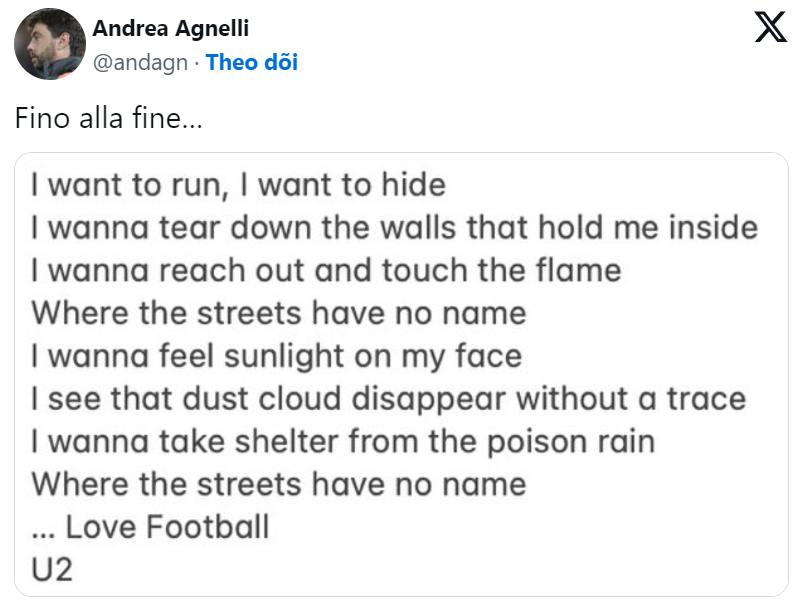 Agnelli đăng một đoạn lời bài hát “Where the Streets Have No Name” của ban nhạc nổi tiếng người Ireland, U2 lên tài khoản X cá nhân kèm chú thích “Fino alla Fine” – câu khẩu hiệu của Juventus (tạm dịch “Cho đến cuối cùng”). Chưa ai có thể hiểu thông điệp mà sếp cũ của “ông lớn” Serie A muốn gửi gắm.