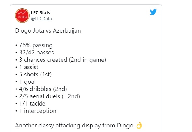 Tiền đạo Diogo Jota của Liverpool tiếp tục khởi đầu mùa giải tuyệt vời vào đêm qua, khi anh ghi 1 bàn thắng và kiến tạo 1 bàn cho Bồ Đào Nha. Selecao châu Âu đã có chiến thắng 3-0 trước Azerbaijan trong cuộc đụng độ tại bảng A vòng loại FIFA World Cup, với Bernardo Silva và Andre Silva cũng tìm có riêng cho mình 1 bàn thắng.