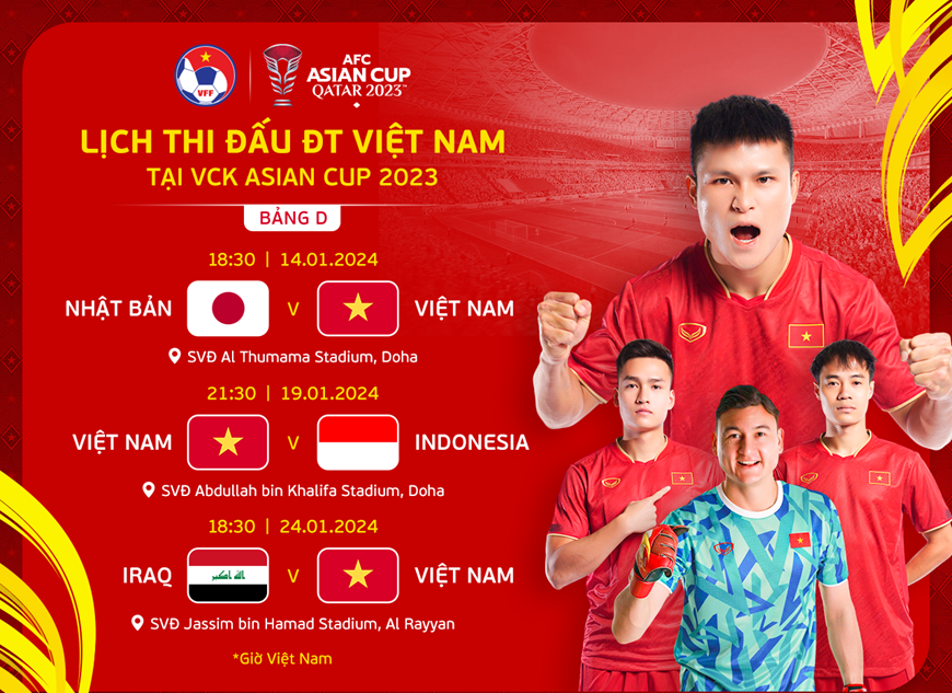 Lịch thi đấu của đội tuyển Việt Nam tại vòng bảng Asian Cup 2023. Ảnh: VFF